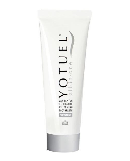 El dentífrico blanqueador All in One Wintergreen Yotuel está formulado para el uso diario, utilizando peróxido de carbamida, flúor, calcio, xilitol y fosfatos, que ayudan a blanquear eficientemente los dientes. Su sabor Wintergreen proporciona una sensación refrescante.